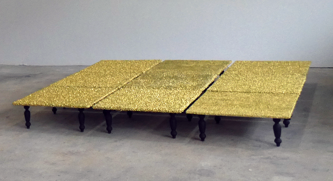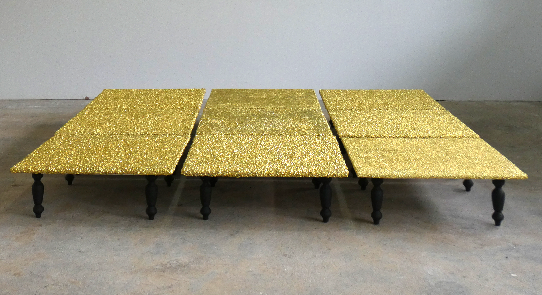 Grain, resin, gold leaf, silver paint, wood, table legs