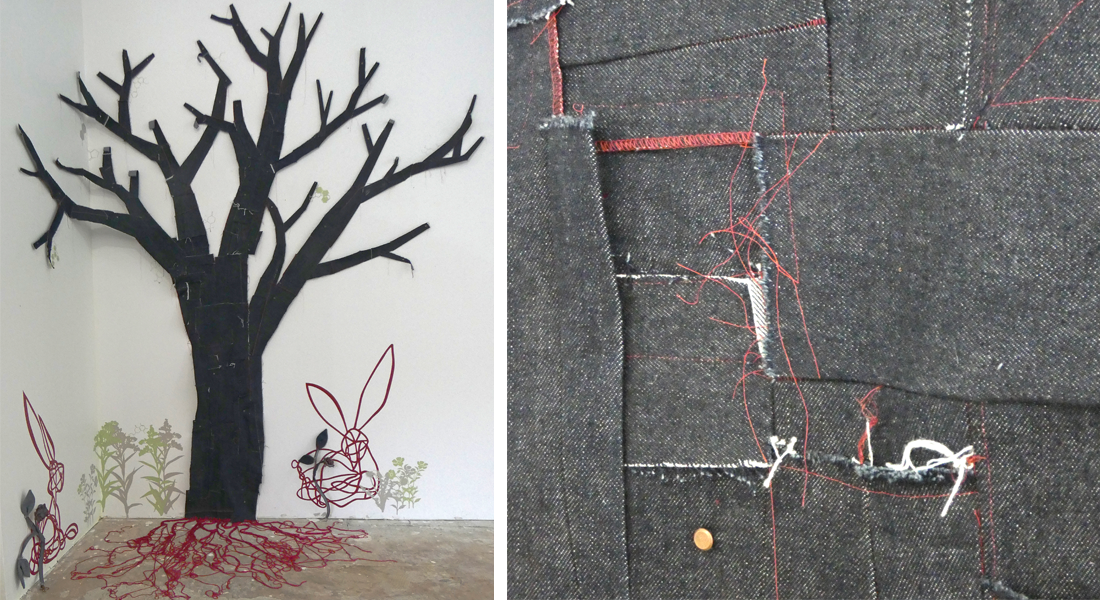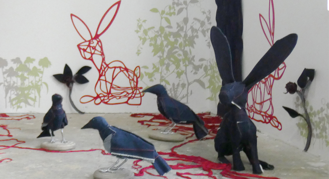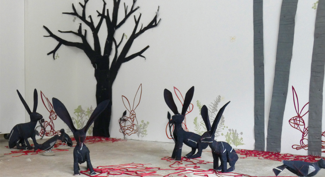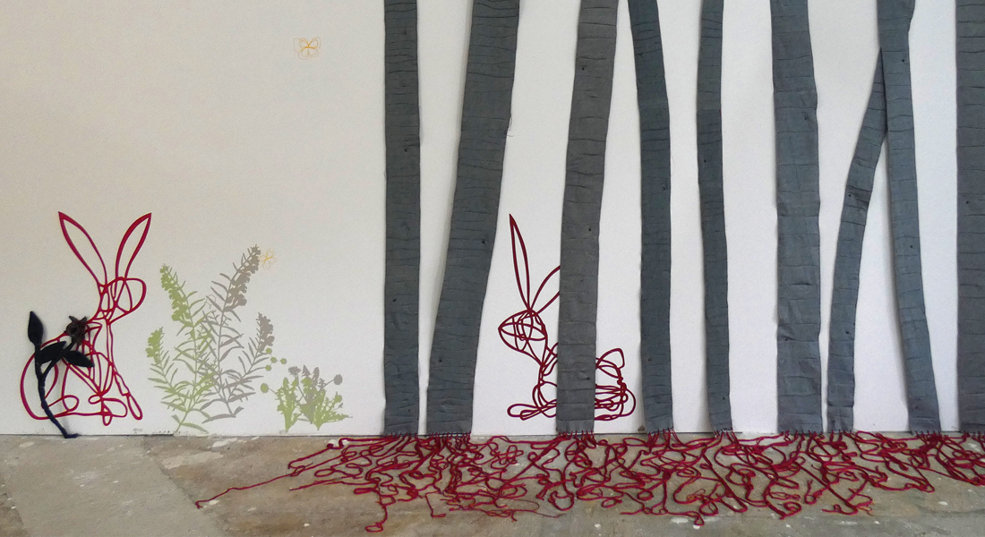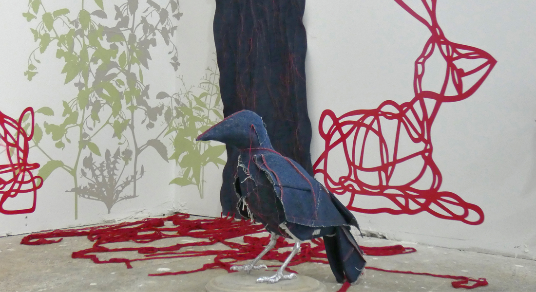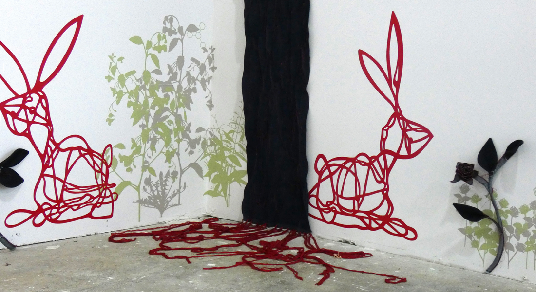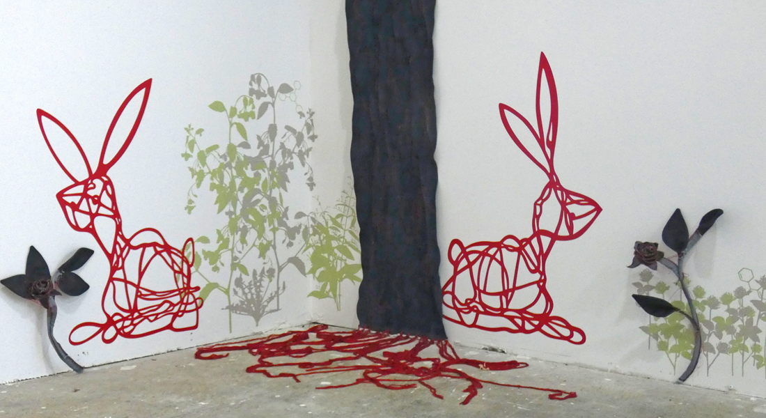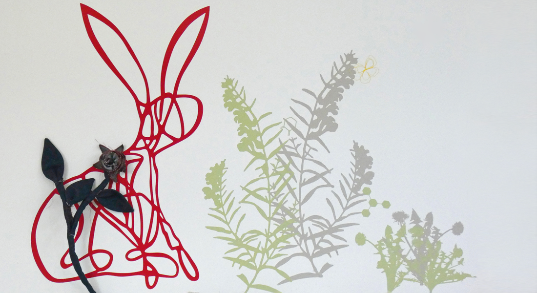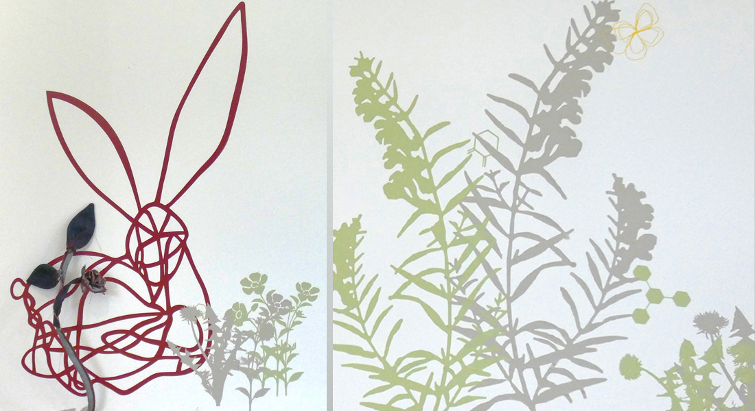 Kindred is an evolution of ensemble, the work I made in South Africa in 2019 referencing Alice in Wonderland and exploring traditional plants used to treat brain cancer, re-envisioned using plants and compounds that aid in the treatment of Lyme’s Disease (Black Walnut, Aspens, Cats Claw, Hairy Rice Rose, Knot Weed, Sage wort, Skullcap – and I will continue to research). The wall has cut vinyl molecular drawings of the chemical compounds.